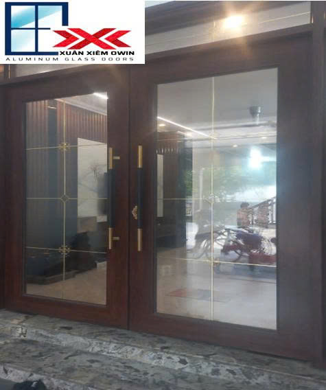 Cửa chính của ngôi nhà sử dụng dòng nhôm thủy lực Owin cao cấp với bề mặt sơn vân gỗ trắc, giúp tạo cảm giác ấm cúng, sang trọng nhưng vẫn giữ được sự bền chắc theo thời gian.